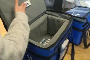 Carrying case for the anti-Covid vaccine equipped with the temperature tracking sensor of the Montpellier start-up Koovea – © François Jobard, France 3 Occitanie.
